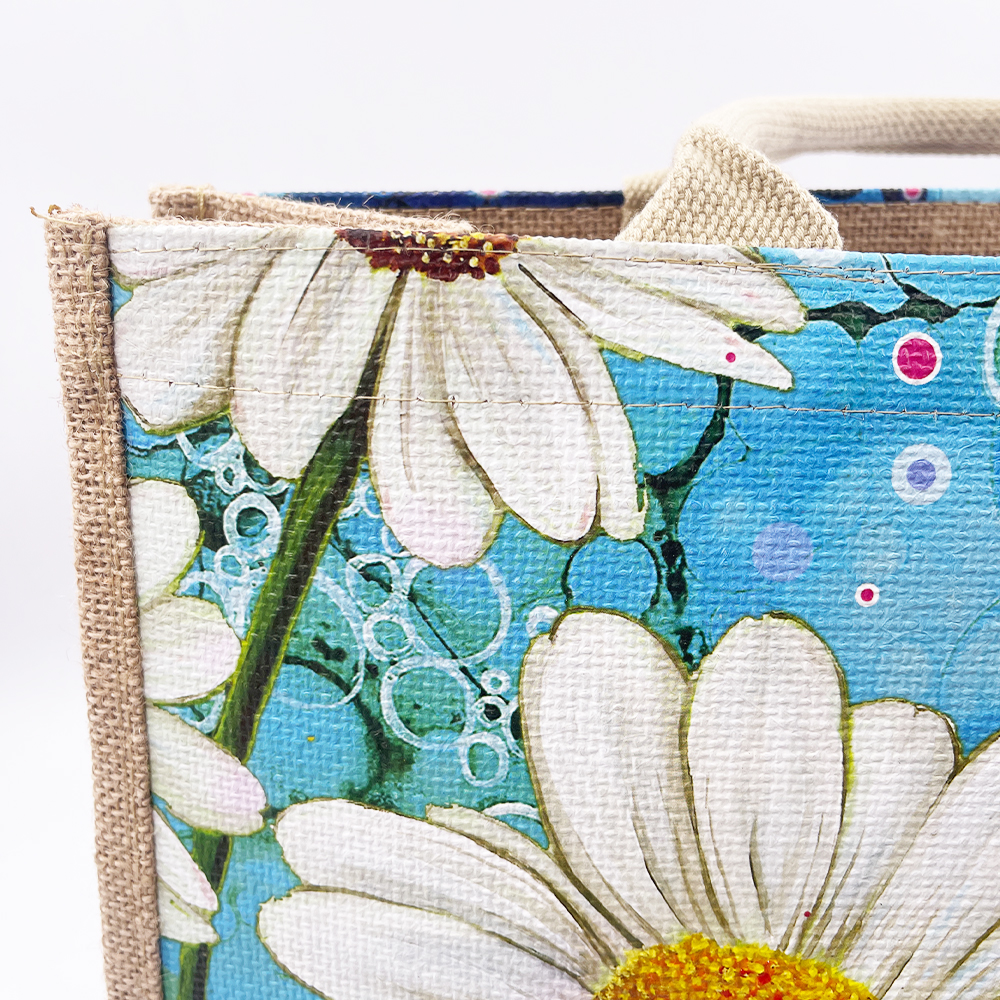 *Material: 60*60 Jute,with PE lamination on back *Cotton Rope Handle *Size:17.3″W*13″H*5.9″D *heat transfer printing,two sides *Packing:50pcs/carton