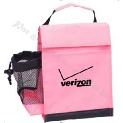 Lunch Bag , one side with mesh drawstring bag. *Use velcro closure flap, a front open pocket. *Packing:1pc/opp bag, 100pcs/CTN. 210D Polyester +2mm PE sponge + aluminium film , Mesh. 1-C imprint logo on one postion.
