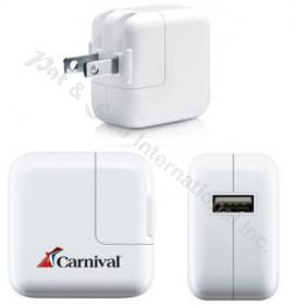 USB travel Wall charger, output 5V 2.1A . *Packing:1pc/micro fabric drawstring bag, 500pcs.CTN.ABS.Heat transfer print on Charger and drawstring bag one position.30days
