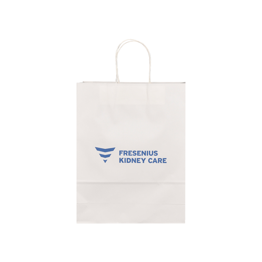 *Material:100gsm white kraft paper *Product Dimensions:10″W x 13″H x 4D” *Imprint:1 color 1 side *twisted paper handle *Packing:500pcs/carton